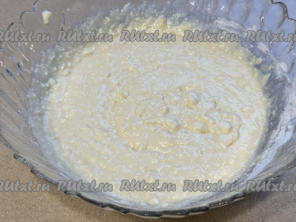 Перемешать массу венчиком до однородности, влить молоко, перемешать творожную смесь.