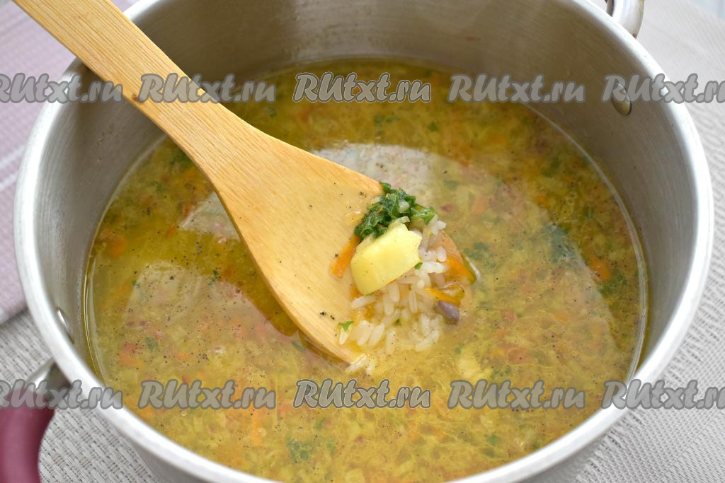 Затем суп перчим, добавляем мелко нарезанную зелень (у меня - замороженная петрушка), перемешиваем, доводим до кипения, провариваем 1 минуту на небольшом огне, убираем с огня.