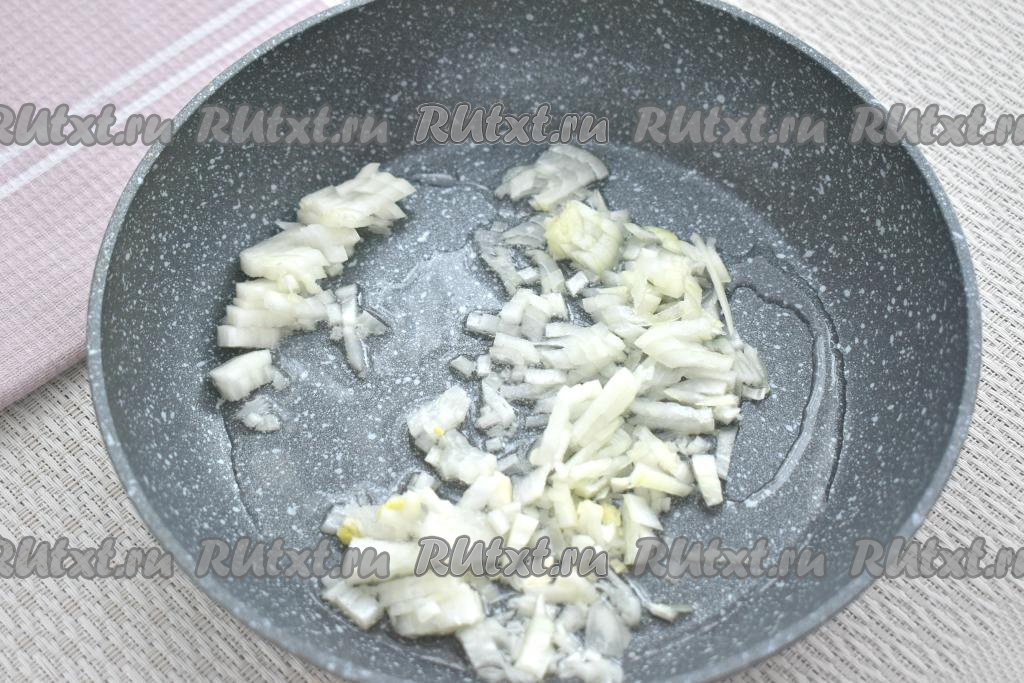 Пока варятся рис и картошка, сразу приступаем к обжарке овощей. Для этого хорошо прогреваем растительное масло в сковороде, выкладываем очищенный и мелко нарезанный лук. Обжариваем лук на среднем огне до мягкости (минуты 3-4), иногда помешивая.