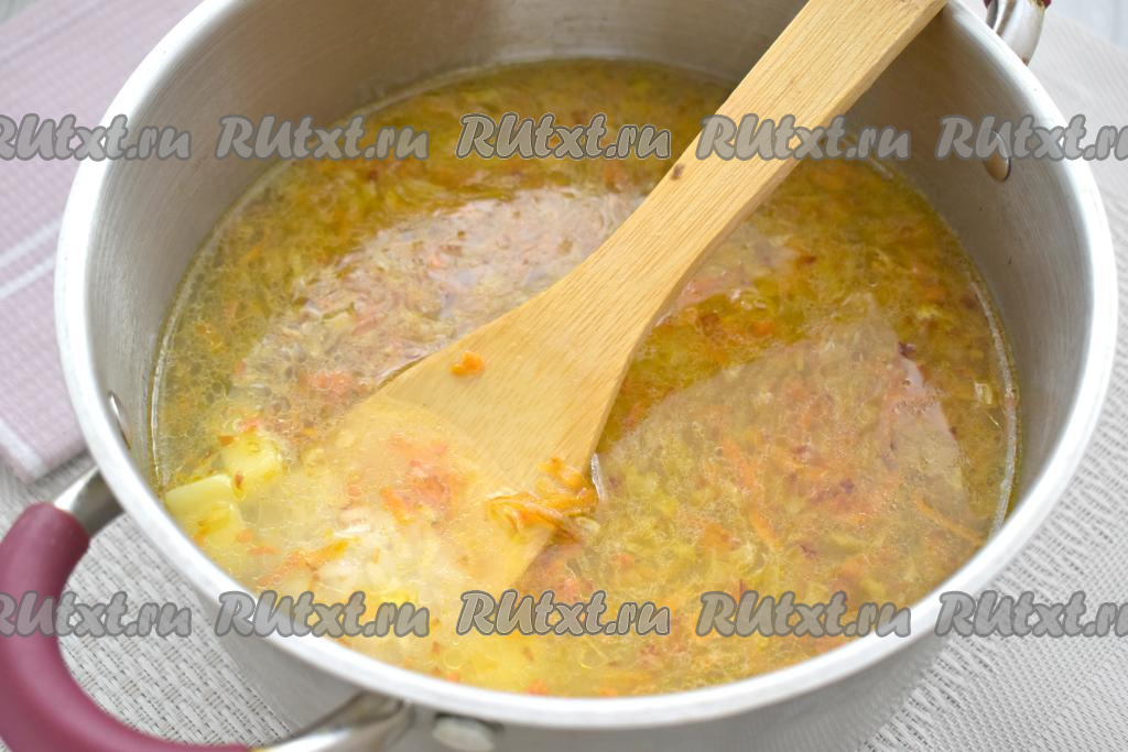 После того как суп из утки с рисом и картошкой с момента закипания проварится 15 минут, добавляем в кастрюлю обжаренные морковку с луком, даём закипеть, если нужно, досаливаем, варим на небольшом огне 4-5 минут.