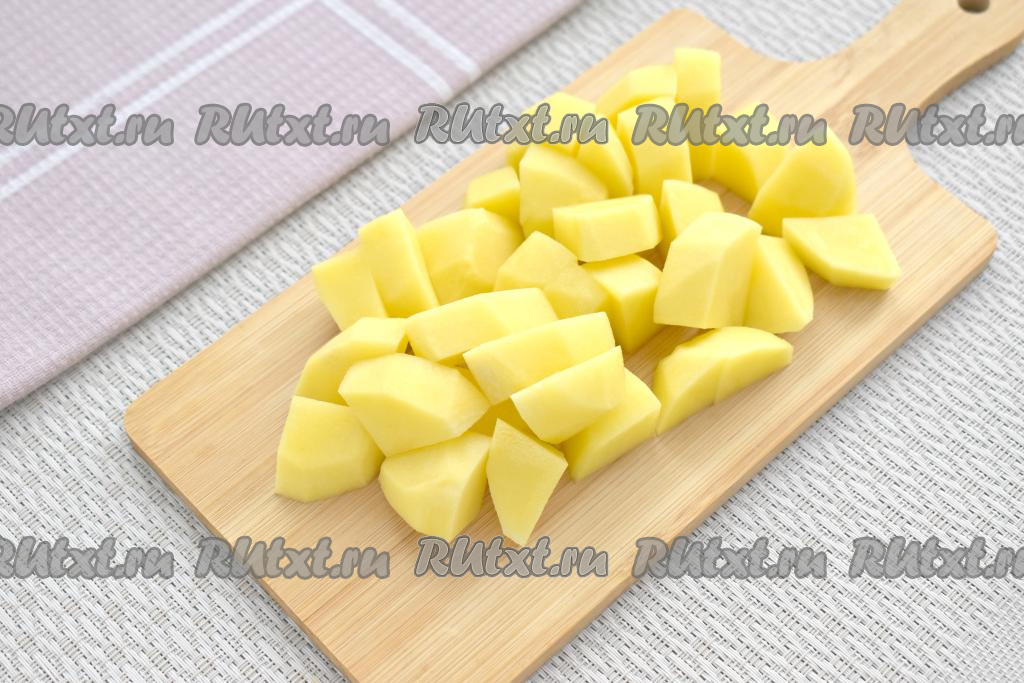 В закипевший утиный бульон выкладываем картошку, нарезанную на средние кубики, даём закипеть, варим на небольшом огне 5 минут.