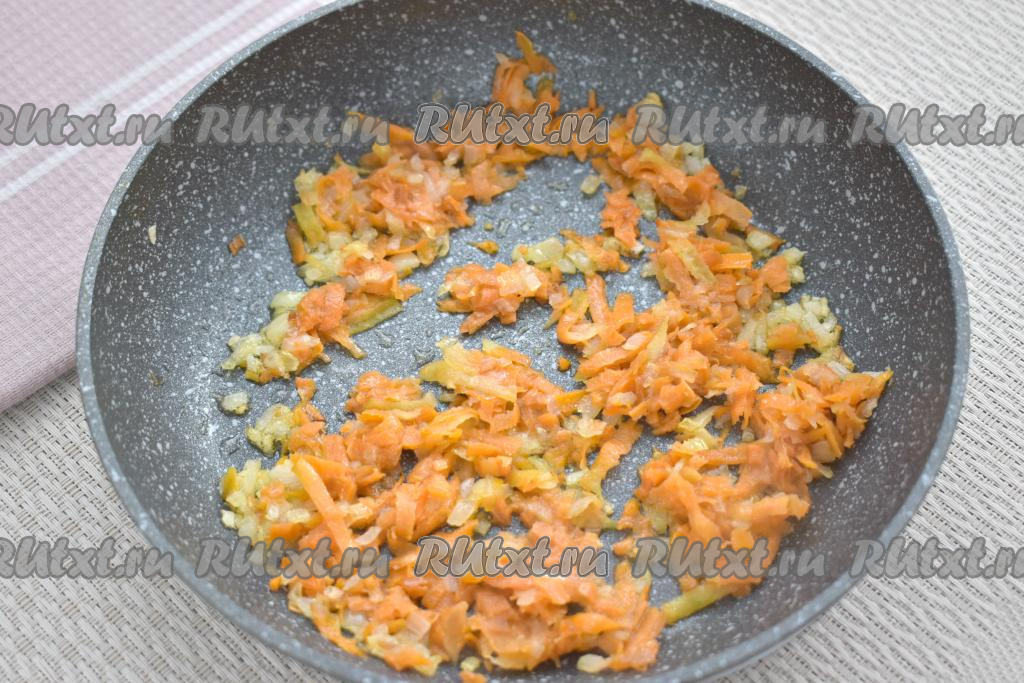 К луку, обжаренному до мягкости, добавляем очищенную морковку, натёртую на крупной тёрке, перемешиваем овощи, обжариваем минут 5 (до мягкости моркови), не забывая время от времени перемешивать. Сковороду с обжаренными овощами убираем с огня.