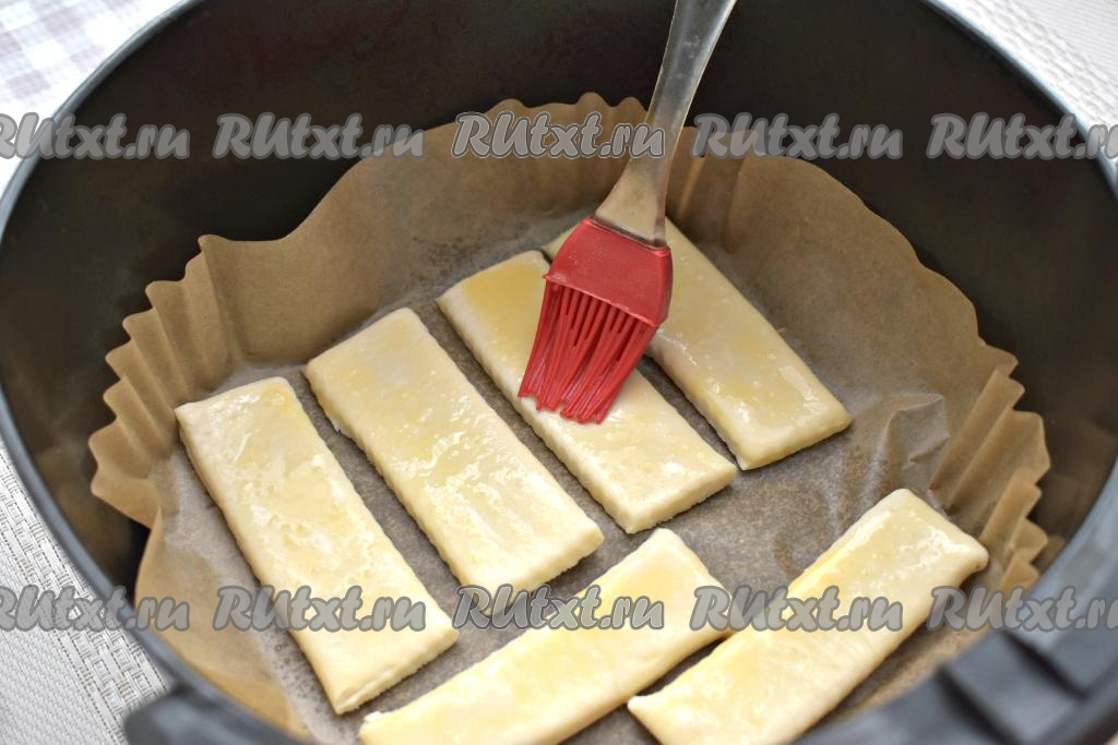 Чашу аэрогриля застилаем пергаментом, выкладываем полоски из слоёного теста в один слой. У меня поместились только 6 полосок, поэтому я выпекала язычки в два захода. Полоски из теста смазываем взбитым яйцом.
