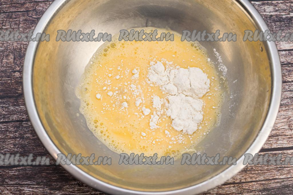 В получившуюся яичную массу по 0,5 столовой ложки начать всыпать муку, каждый раз хорошо вмешивая её.