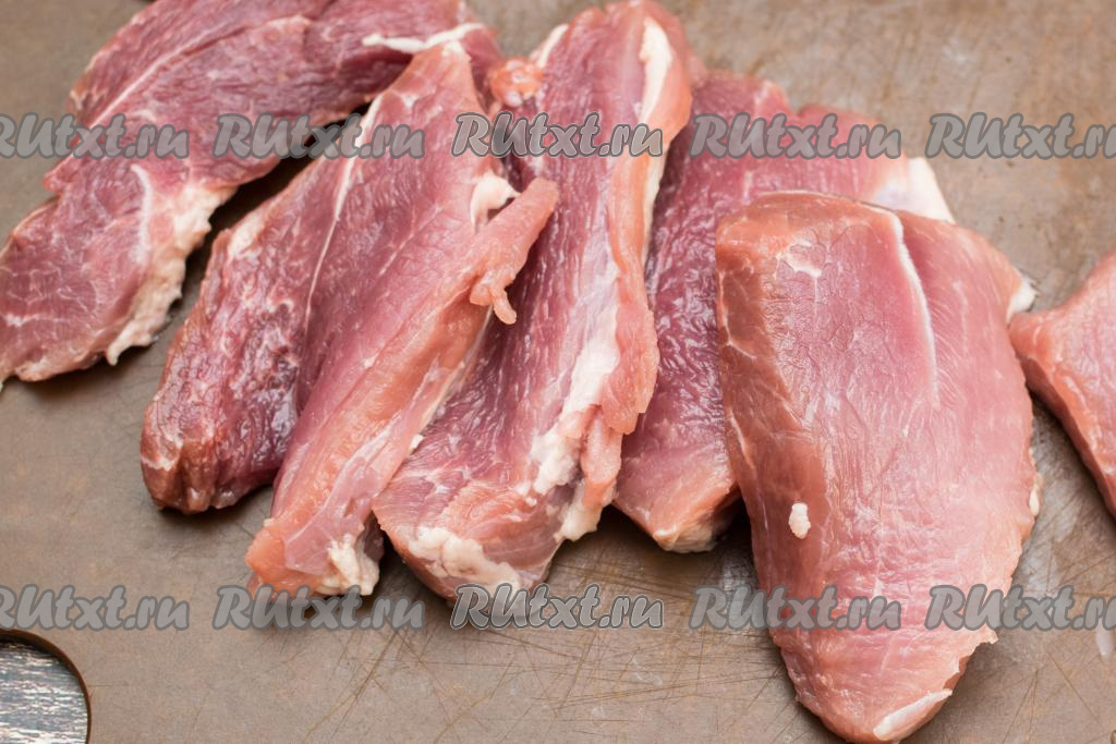Нарезать мякоть свинины на порционные кусочки толщиной примерно 1,5-2 сантиметра.