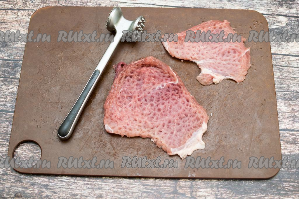 С помощью кулинарного молоточка отбить каждый кусочек свинины с одной стороны до толщины ориентировочно 5-7 миллиметров.