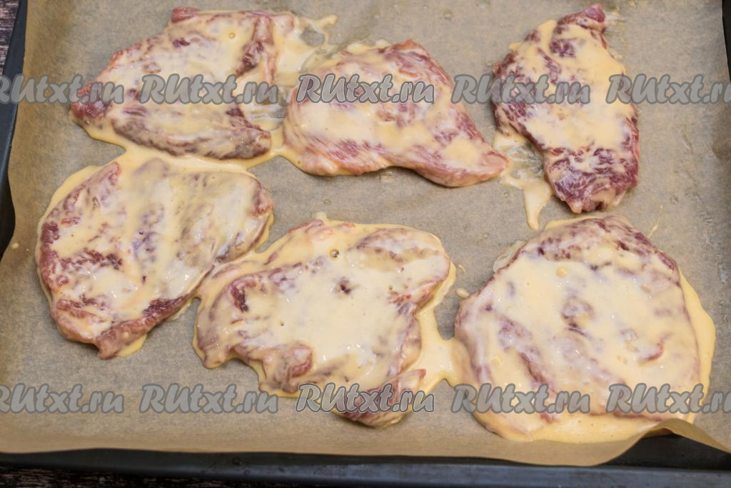На противень, застеленный пергаментом (или фольгой), выкладывать отбивные кляром вверх.