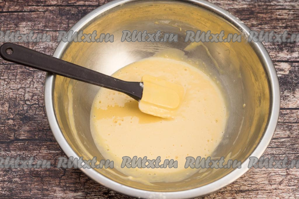 Постепенно подсыпая муку, замесить яичный кляр, который по консистенции будет напоминать густой кефир.