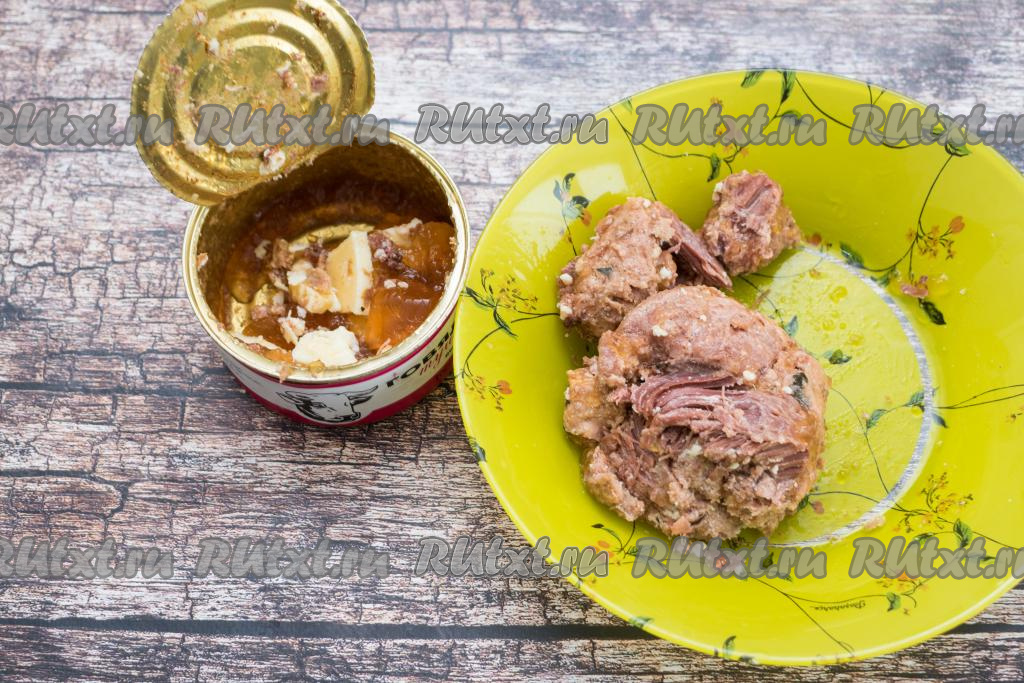 Пока варятся картошка с морковкой, открыть банку с тушёнкой. Выложить мясо из банки на тарелку. Жир с тушёнки я убираю и не использую его для приготовления супа.