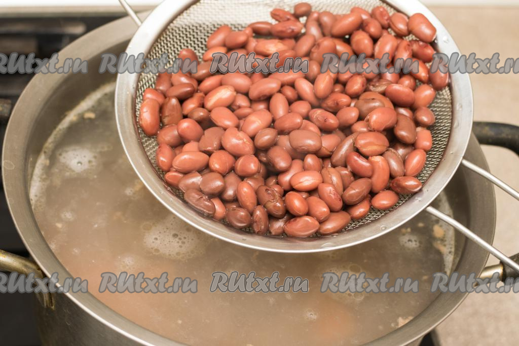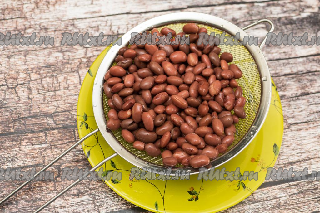 Открыть банку с консервированной фасолью. Откинуть фасоль на сито, промыть под проточной водой, лишней воде дать стечь.