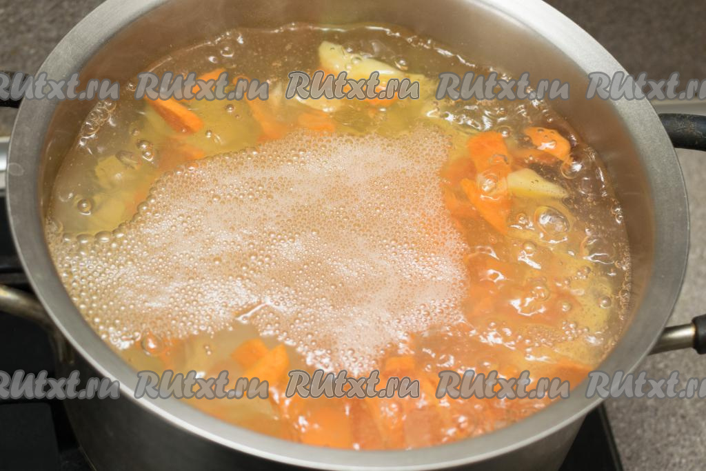 Сразу же за морковью добавить картошку, нарезанную на средние брусочки. Дать воде ещё раз закипеть, уменьшить огонь, варить 10 минут.