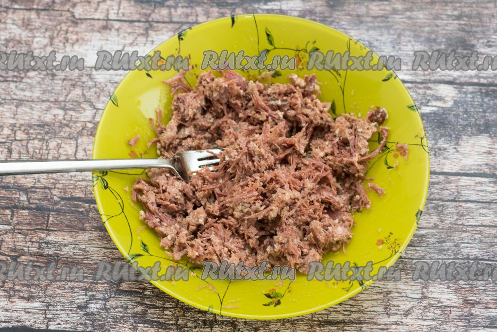 После того как картошка с морковкой с момента закипания проварятся 10 минут, добавить в кастрюлю тушёнку, размятую вилкой.