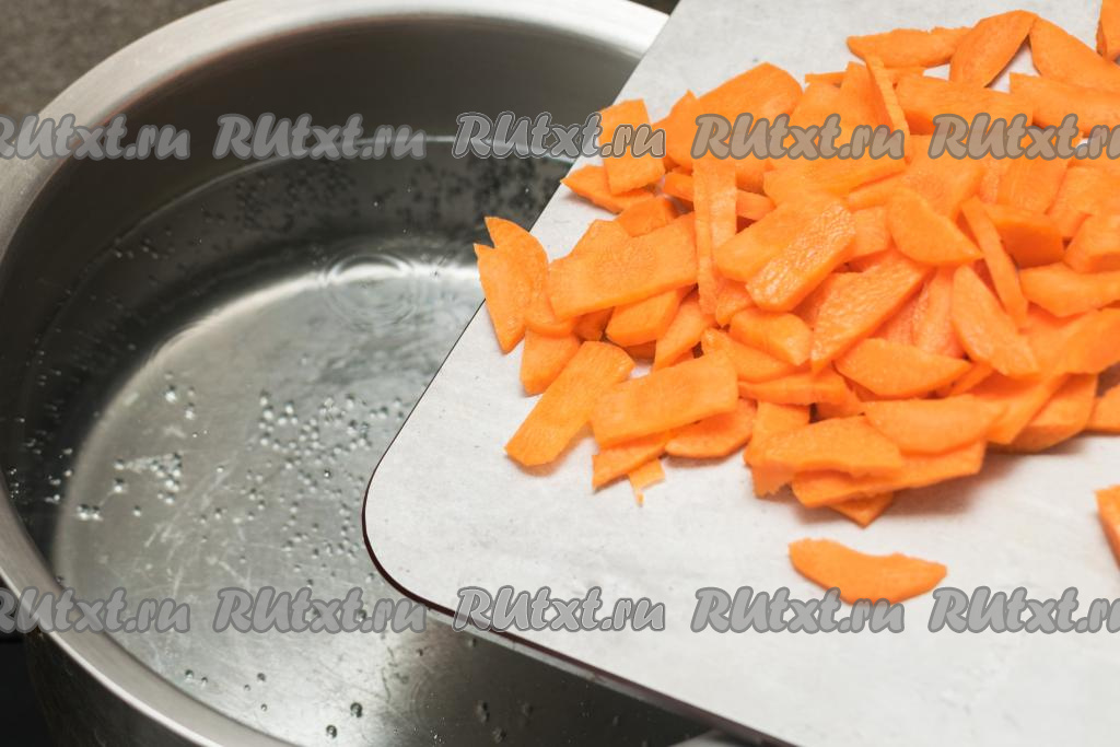 Влить в кастрюлю 2 литра воды, поставить на сильный огонь. Довести воду до кипения. Пока вода закипает нужно очистить морковку и картошку. Пока закипает вода, чтобы картофель не потемнел, можно его выложить в небольшую ёмкость и полностью залить водой. Нарезать морковь на достаточно тонкие брусочки (или полукружочки). В кастрюлю с закипевшей водой добавить нарезанную морковку.