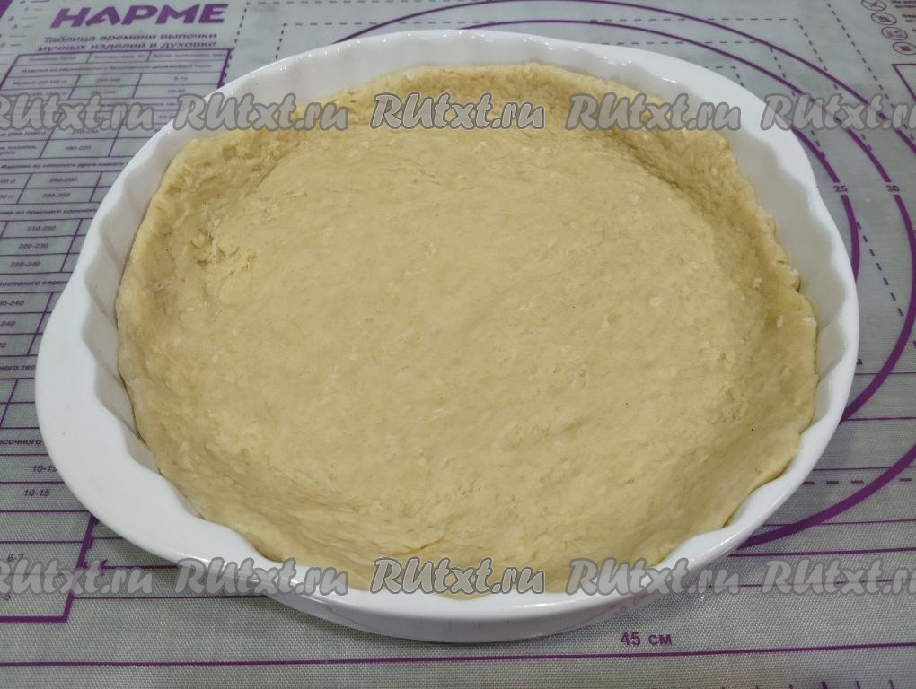 Одну часть теста на присыпанной мукой поверхности раскатываем скалкой в круг, диаметр которого должен быть немного больше размера формы для выпечки. Тесто мягкое, поэтому раскатывается оно хорошо. Пирог я выпекала в форме диаметром 26 сантиметров. Форму для выпечки смазываем растительным маслом, выкладываем раскатанное тесто, формируем из теста бортики.
