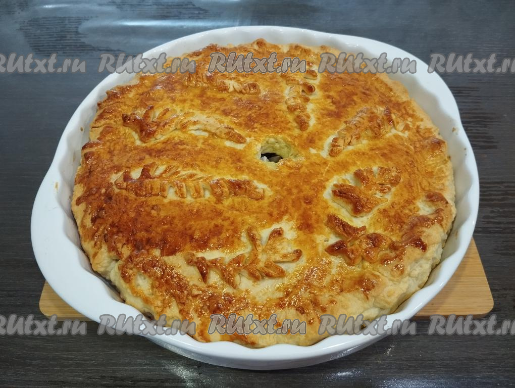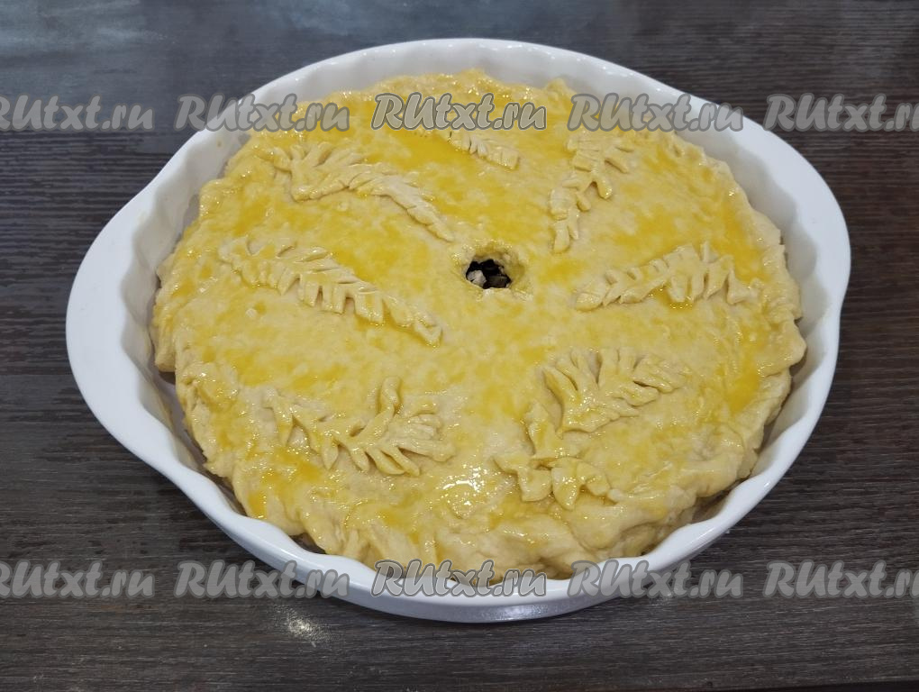 Вторую часть теста раскатываем в круг такого же диаметра, как была раскатана первая часть теста, накрываем начинку, скрепляя края с первой частью теста. Из ранее отложенной части теста делаем украшение и выкладываем его на пирог. В середине пирога с помощью ножа аккуратно вырезаем отверстие для выхода пара. Оставляем пирог для расстойки минут на 20.