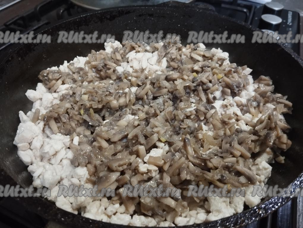 В сковороду с куриным филе, обжаренным до готовности, выкладываем жареные грибы с луком, солим по вкусу, перемешиваем и томим на небольшом огне 5 минут. Убираем с огня.