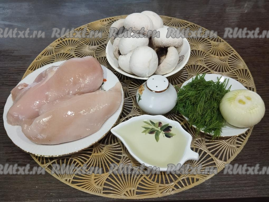 Пока дрожжевое тесто для пирога с курицей и грибами поднимается, приготовим начинку. Для этого шампиньоны, куриное филе и укроп промываем водой, даём немного обсохнуть. Лук очищаем.