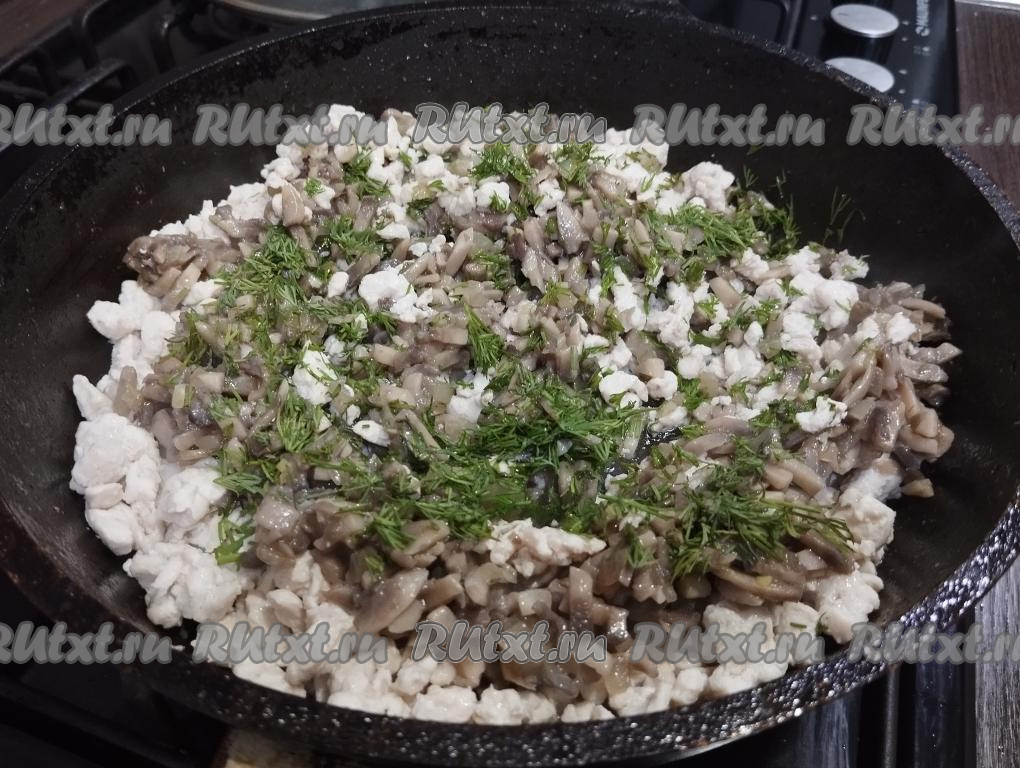 К мясу курицы и грибам добавляем мелко нарезанный укроп, перемешиваем и оставляем начинку для пирога остывать. Можно переложить начинку в тарелку для более быстрого остывания.