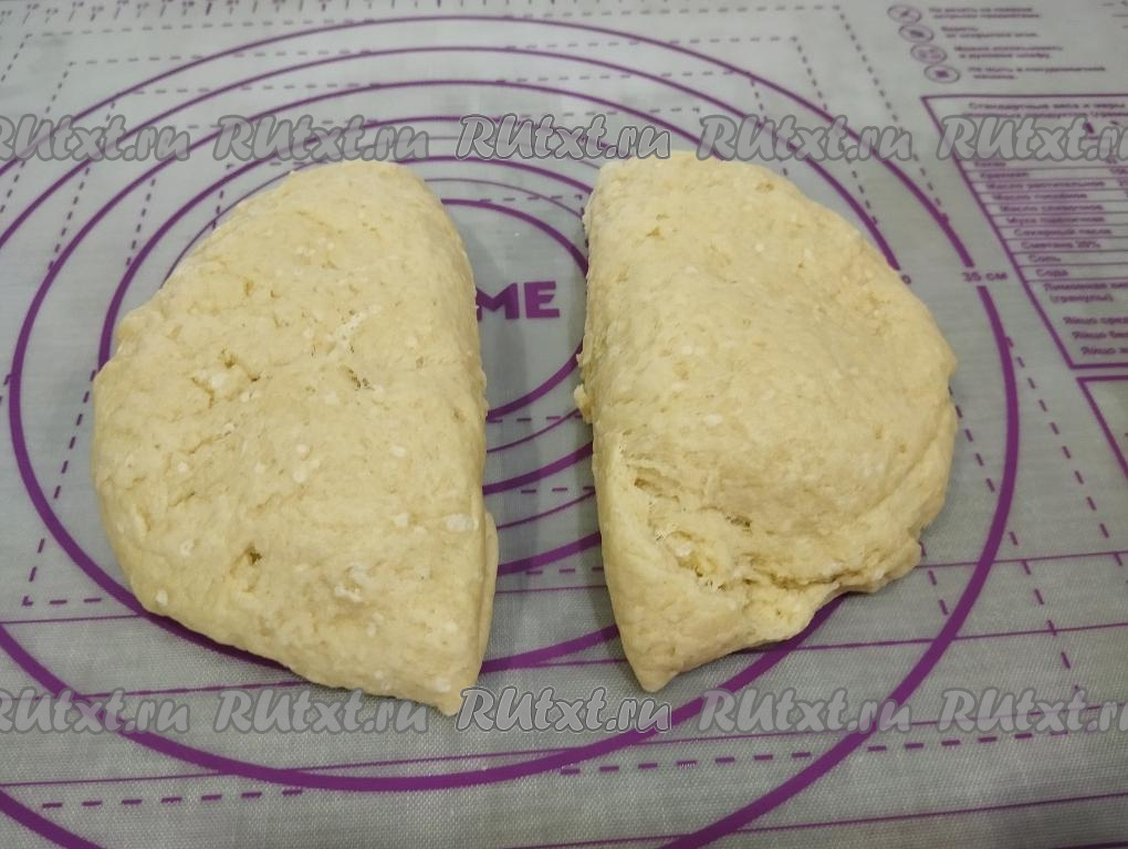 Поднявшееся тесто обминаем. Отделяем совсем немного теста для украшения пирога. Оставшееся тесто делим на 2 равных части.