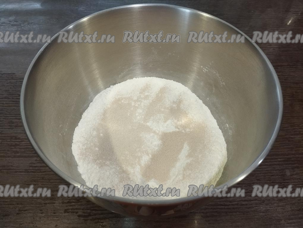 В объёмной миске соединяем соль, сахар, 400 грамм просеянной муки, дрожжи, перемешиваем сухие ингредиенты.
