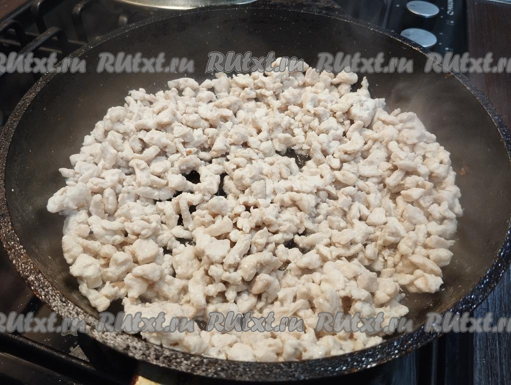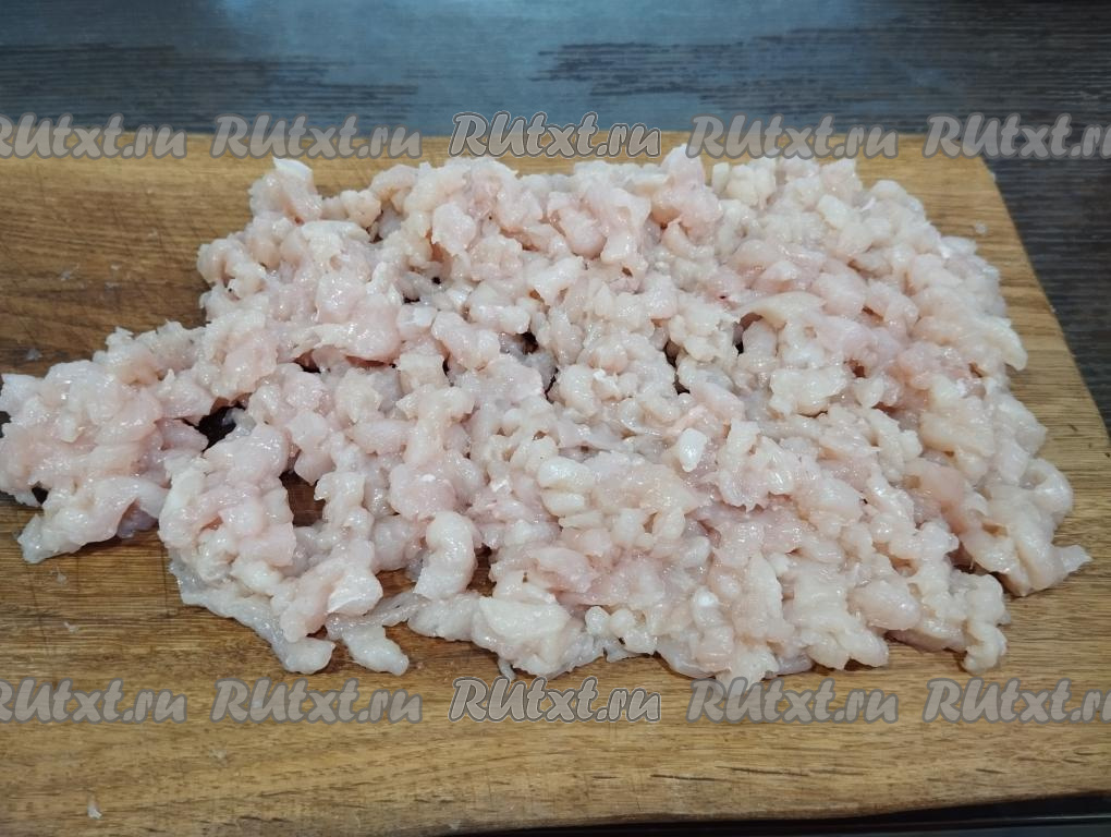 Куриное филе нарезаем на мелкие кубики. Удобно нарезать мясо, когда оно слегка подморожено.