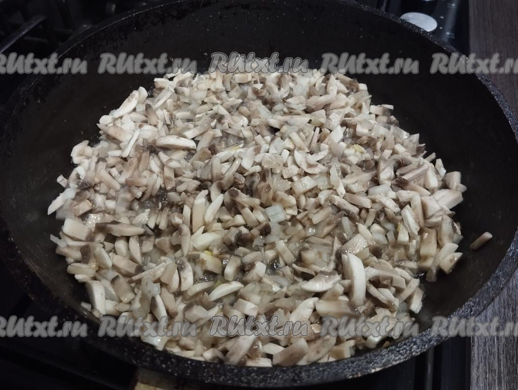 Шампиньоны и лук нарезаем мелко. На сковороде хорошо прогреваем растительное масло, выкладываем грибы с луком и жарим на среднем огне минут 7-8 (до готовности грибов и мягкости лука), периодически перемешивая. Жареные шампиньоны с луком перекладываем со сковороды на тарелку.