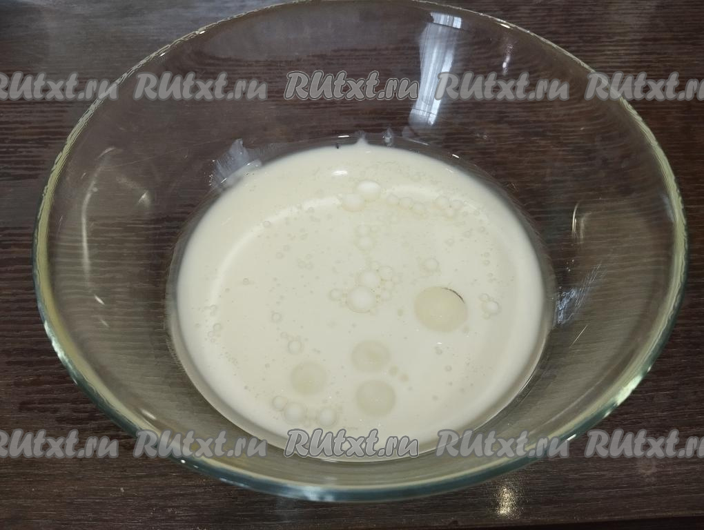Кефир вместе с растительным маслом соединяем в глубокой тарелке и подогреваем примерно до 37 градусов. Если нет термометра, можно измерить температуру пальцем, смесь кефира и масла должна быть тёплой, приятной по ощущениям.
