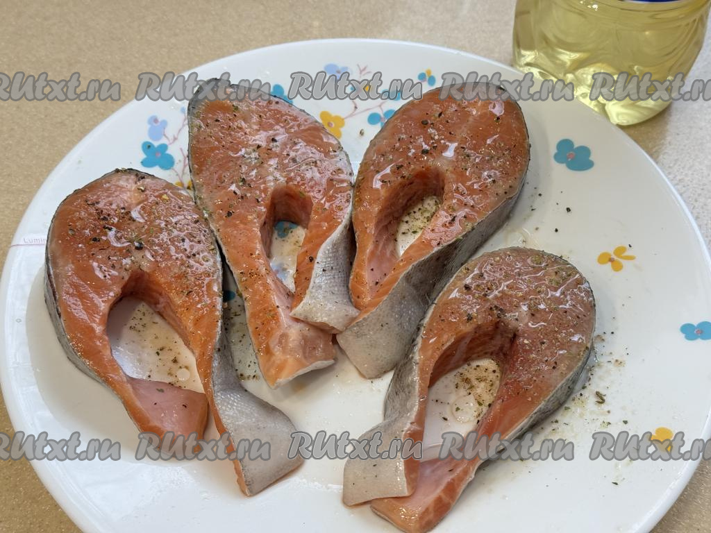 Для этого блюда можно купить форель, уже разделанную на порционные стейки, а затем, если рыба заморожена, разморозить её, промыть водой, обсушить. А можно купить целую рыбку, разморозить её, отрезать голову, плавники, удалить всё из брюшка вместе с чёрной плёночкой, промыть водой, а после этого нарезать форель на кусочки толщиной 2,5-3 сантиметра, обсушить бумажным полотенцем. Подготовленные стейки форели посолить и поперчить с двух сторон, сбрызнуть маслом. Оставить стейки промариноваться на 15 минут.