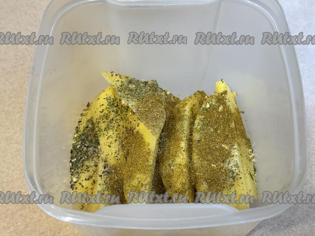 Дольки картофеля поместить в лоток с крышкой, добавить сухие специи и соль по вкусу.