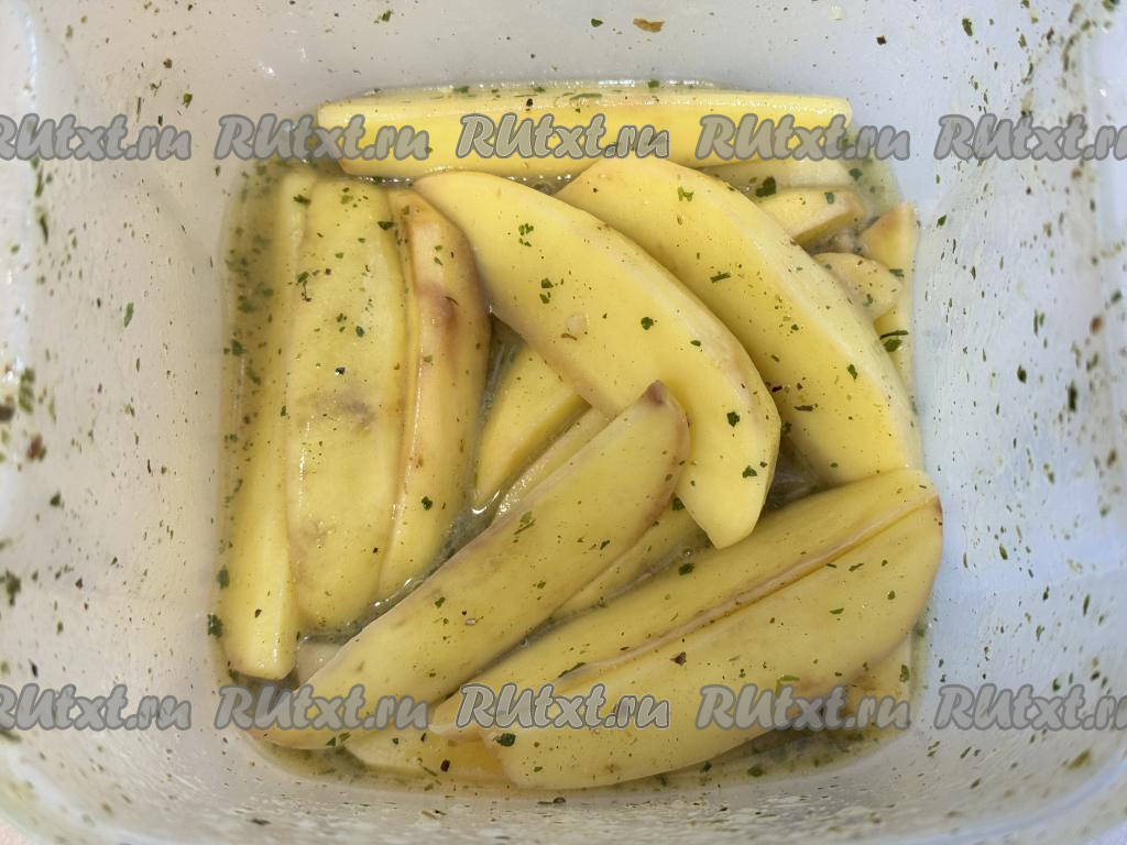 Закрыть лоток крышкой. Хорошо потрясти закрытый лоток с картофелем, чтобы дольки равномерно покрылись маслом и специями со всех сторон. Можно и просто тщательно перемешать картофель руками, равномерно покрывая его маслом и специями. Оставить картошку на минут 10.
