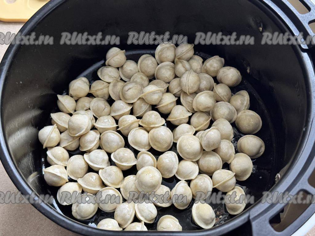 В чашу аэрогриля, убрав из неё решётку, выложить пельмени. Сбрызнуть пельмени маслом, выставить температуру 180 градусов, время - 10 минут. Отправить чашу с пельменями в аэрогриль.
