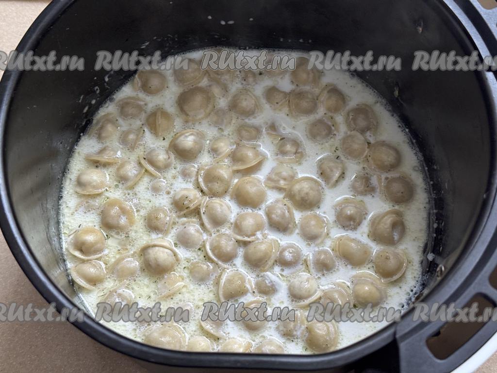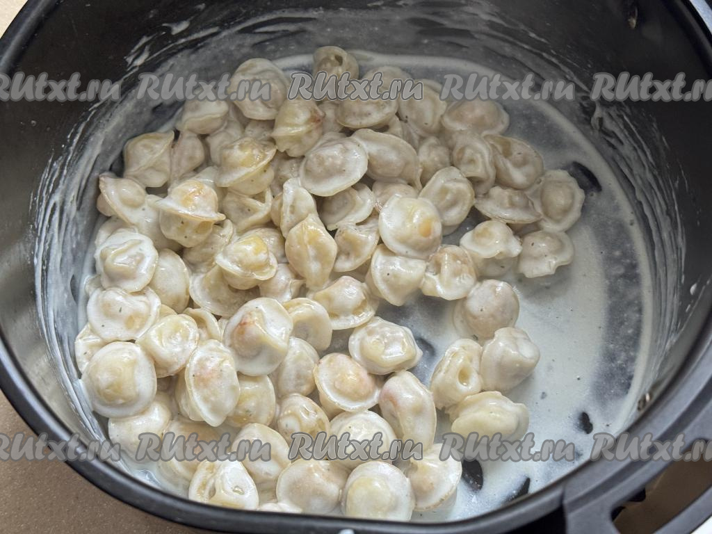 Перемешивая пельмени со сливками каждые 4 минуты, готовить до звукового сигнала аэрогриля. Сливки практически все впитаются в тесто пельменей.