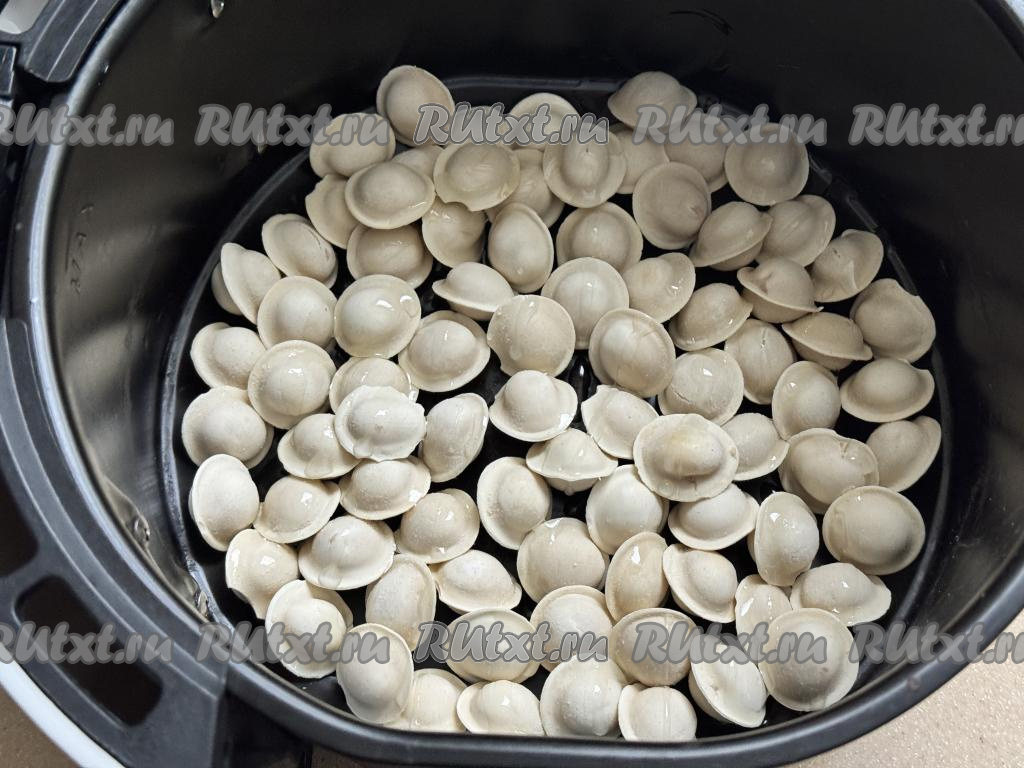 Доставая чашу из аэрогриля каждые 3-4 минуты и встряхивая пельмени, готовить до звукового сигнала.