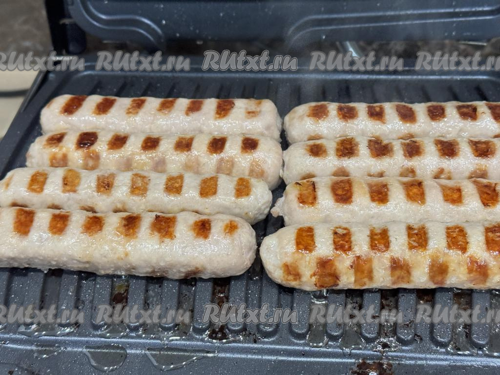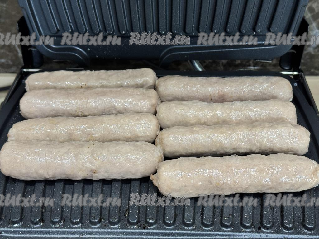 Достать купаты из кастрюли. Переложить купаты на разогретый электрогриль в один слой. Панели гриля маслом можно не смазывать.