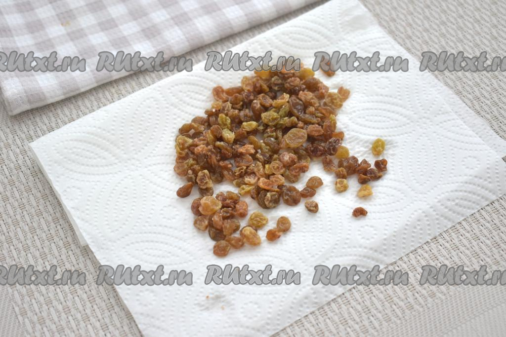 Слоёное тесто достаём из морозилки, даём ему разморозиться при комнатной температуре, чтобы оно стало достаточно мягким. Изюм перекладываем в миску, заливаем полностью кипящей водой, оставляем минут на 5, после этого откидываем на сито, промываем проточной водой, даём лишней воде стечь. Раскладываем изюм на бумажном полотенце, чтобы он обсох.