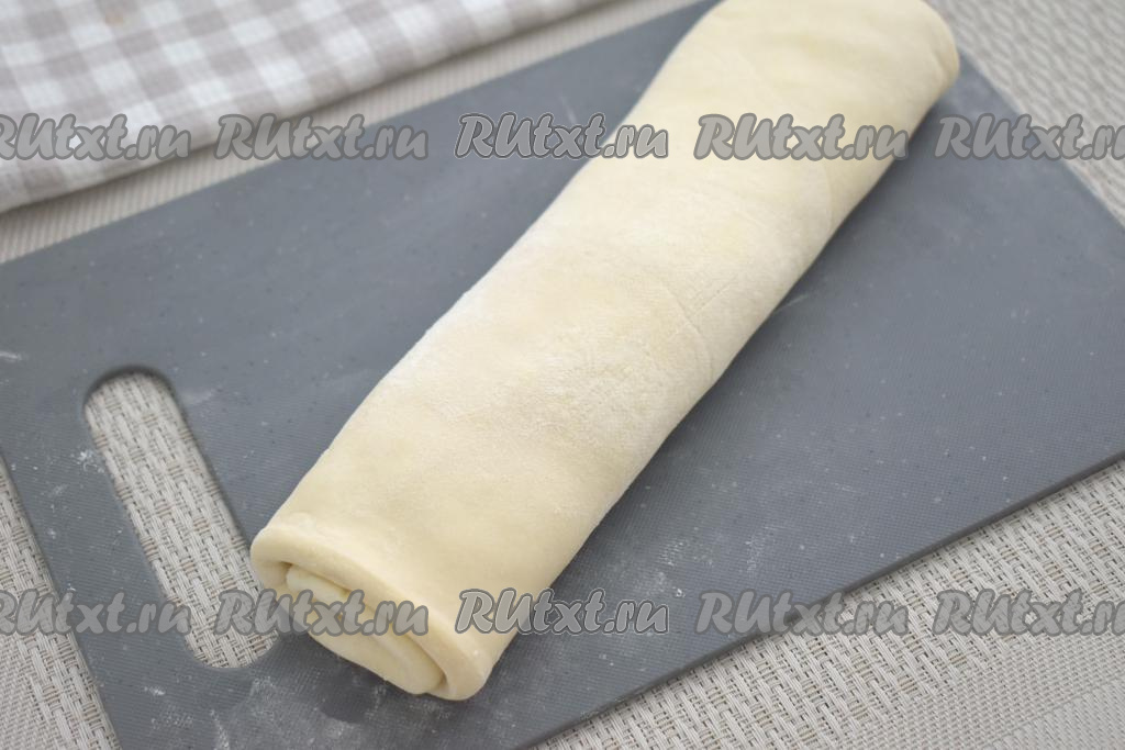 Начиная с более узкой стороны пласта, сворачиваем тесто с начинкой в неплотный рулет. Край теста немного смазываем водой и прижимаем к сформированному рулету. Выкладываем рулет швом вниз.