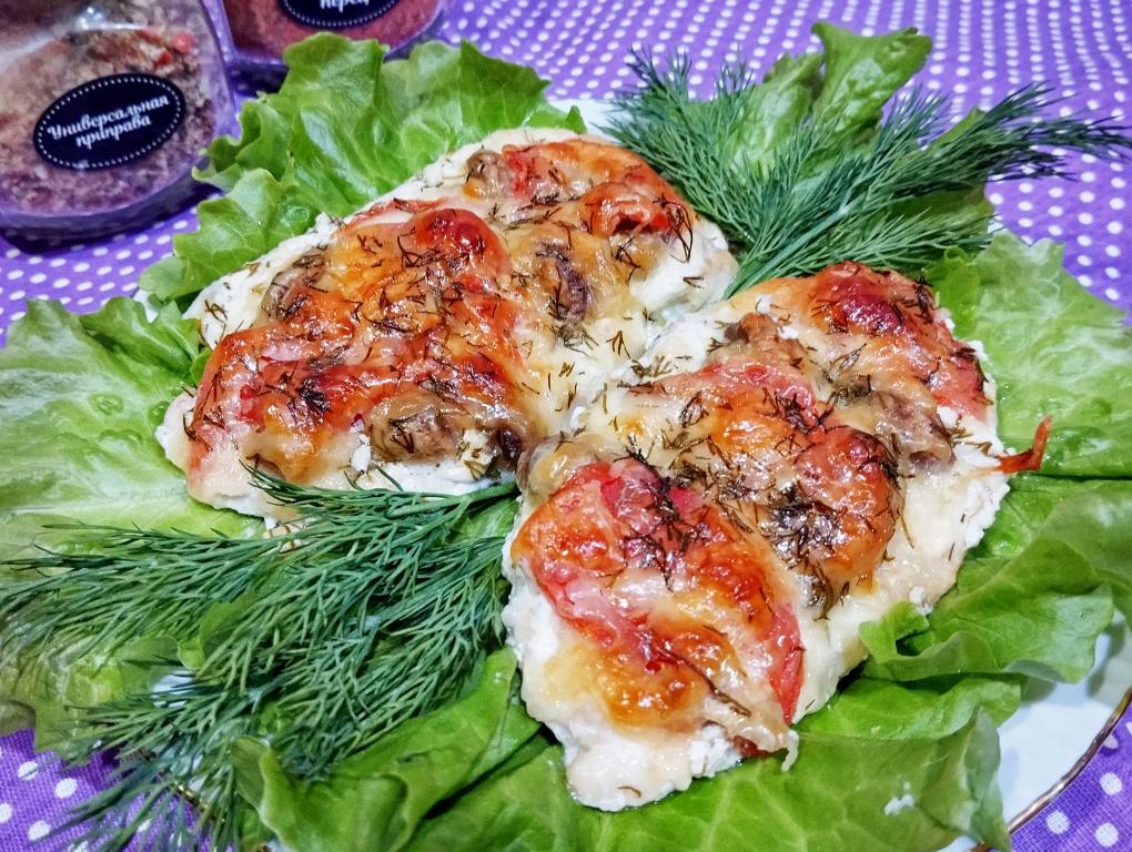 Готовое блюдо достаём из духовки. Аппетитные, вкусные, нежные куриные отбивные, запечённые с грибами и помидорами под сыром, к столу подаём горячими.