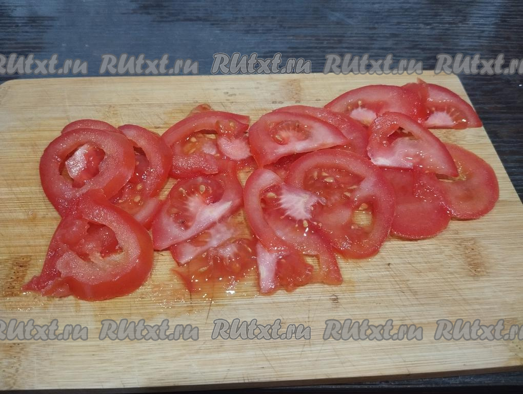 Полукружочки помидора равномерно выкладываем поверх грибов.