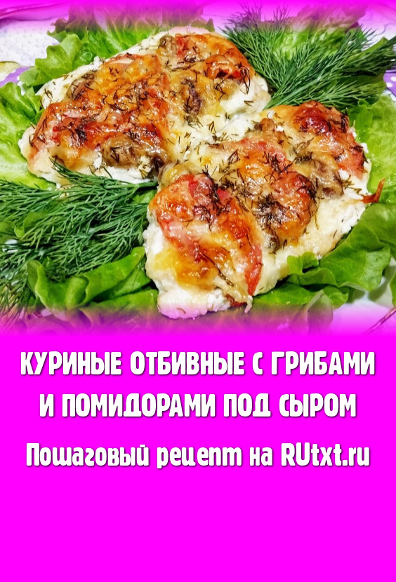 Предлагаю запечь куриные отбивные с грибами и помидорами под сыром в духовке. Это мясное блюдо отлично подойдёт как для повседневного обеда или ужина, так и для праздничного стола. Куриные отбивные получаются мягкими, аппетитными. Сочетание грибов, помидоров и сыра придают готовому мясу изысканный вкус. При подаче это мясное блюдо можно дополнить овощами, зеленью или гарниром на ваш выбор.