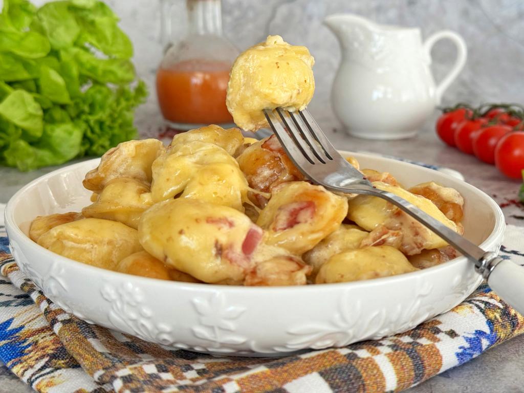 Пельмени, пропитываясь сливками, получаются нежными, сыр добавляет приятную сливочную нотку, а жареный бекон - немного пикантности. Сытно и вкусно, попробуйте!