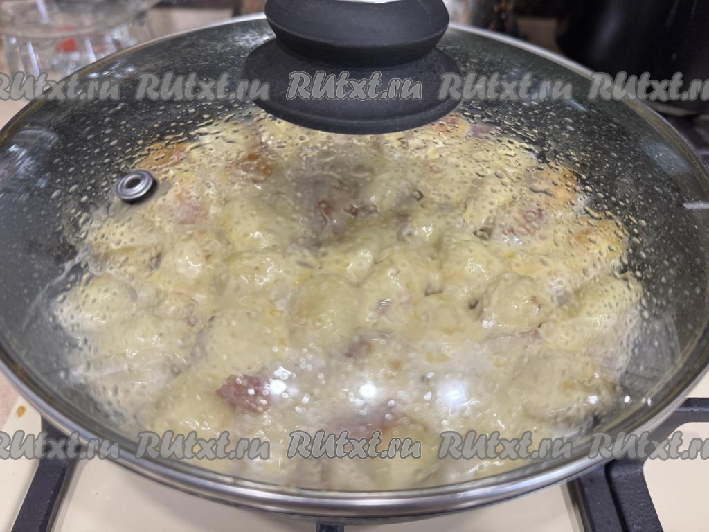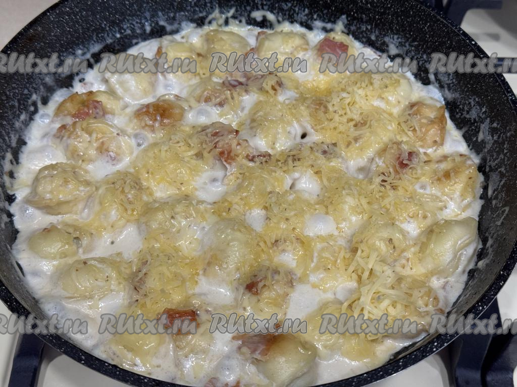 Довести сливки до кипения, сразу убавить огонь до минимума и тушить 8 минут под крышкой, в течение этого времени пельмени с беконом нужно будет несколько раз аккуратно перемешать, чтобы они равномерно протушились в соусе. Затем присыпать пельмени сыром, натёртым на крупной тёрке и, накрыв крышкой, снять сковороду с огня.