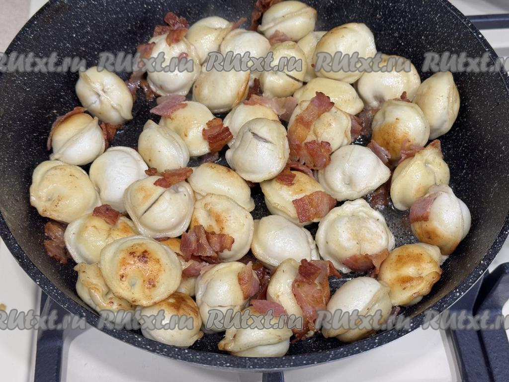 Обжарить пельмени с беконом в течение 10 минут на среднем огне, время от времени аккуратно перемешивая.