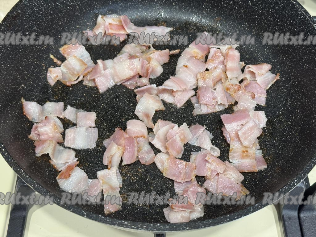 В сковороду влить немного растительного масла, выложить кусочки бекона. Обжарить бекон на среднем огне 5 минут, иногда помешивая.
