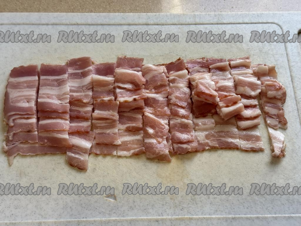 Бекон нарезать на тонкие полоски, а затем полоски нарезать на небольшие кусочки.