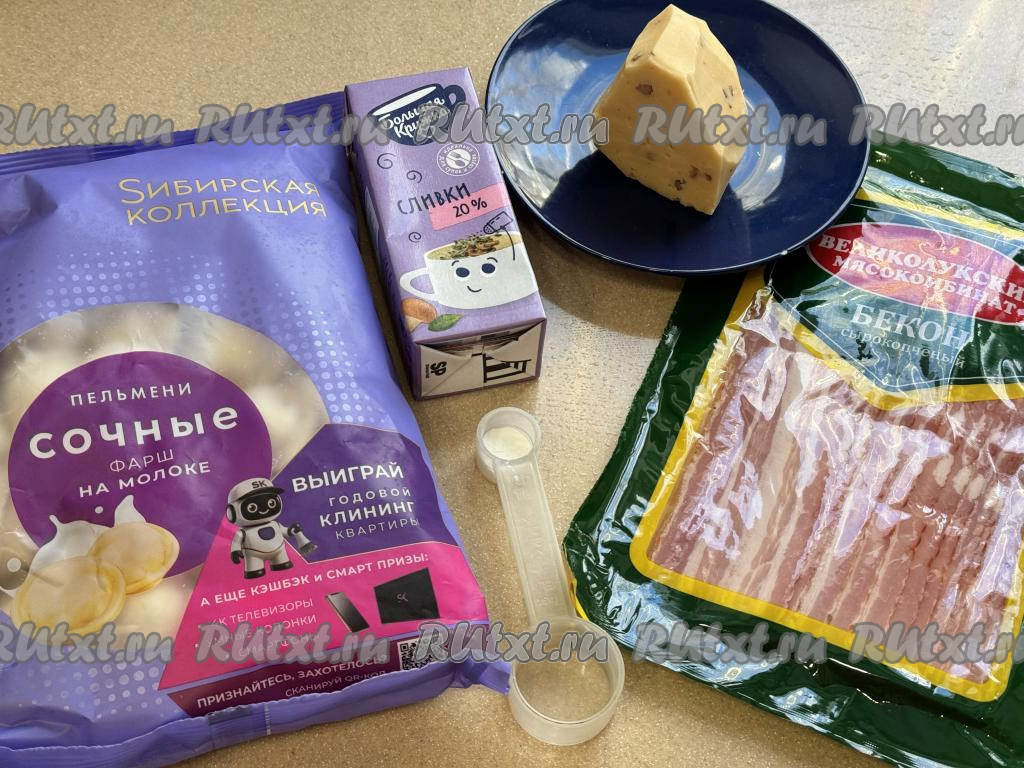 Подготовить продукты. Пельмени предварительно размораживать не нужно. Бекон можно взять любой (у меня - сырокопчёный). Сливки подойдут любой жирности (я использовала жирностью 20%). Крахмал можно взять как картофельный, так и кукурузный.
