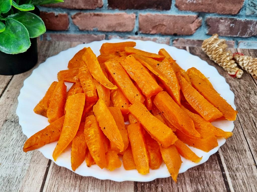 Готовый яркий, вкусный, ароматный батат фри достать из духовки, переложить на тарелку и можно сразу подавать к столу в качестве самостоятельной закуски или в качестве гарнира к мясу, птице.