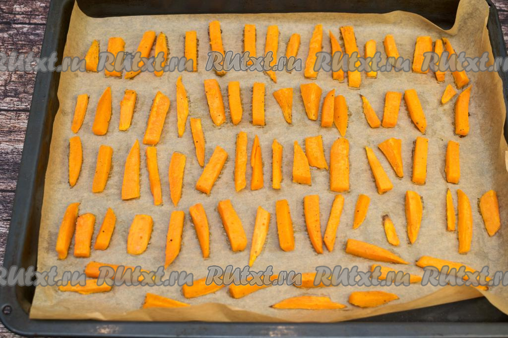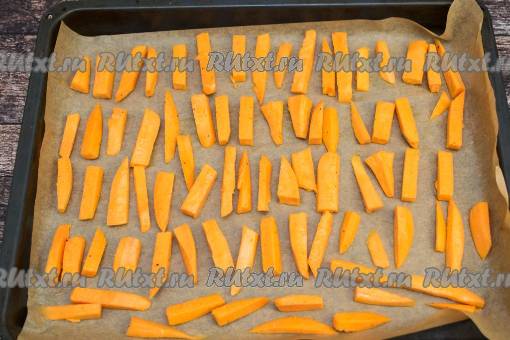 Противень застелить бумагой для выпечки. Выложить на расстеленную бумагу брусочки батата в один слой.