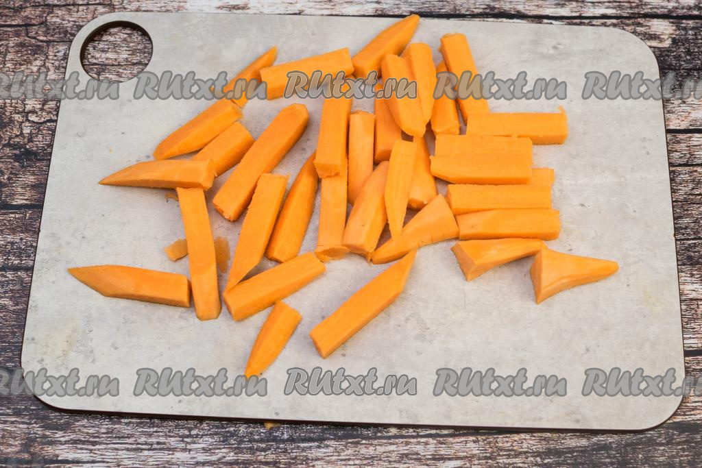 Нарезать батат на брусочки толщиной примерно 5-10 миллиметров, как для картофеля фри.
