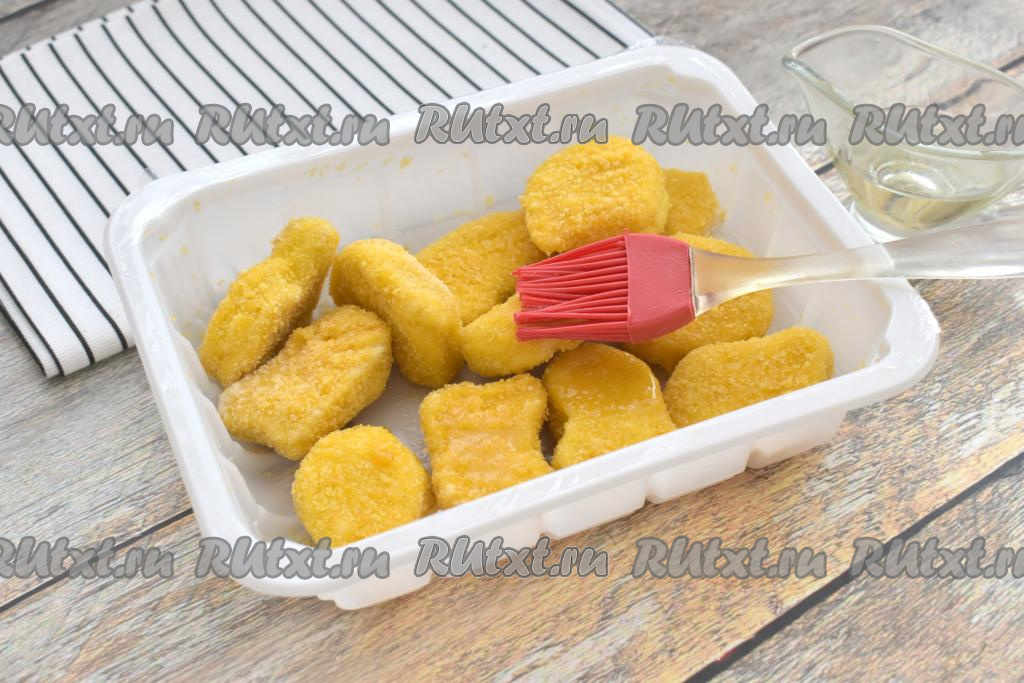 Открываем упаковку готовых замороженных наггетсов, размораживать их не нужно. Замороженные наггетсы немного смазываем с двух сторон растительным маслом.