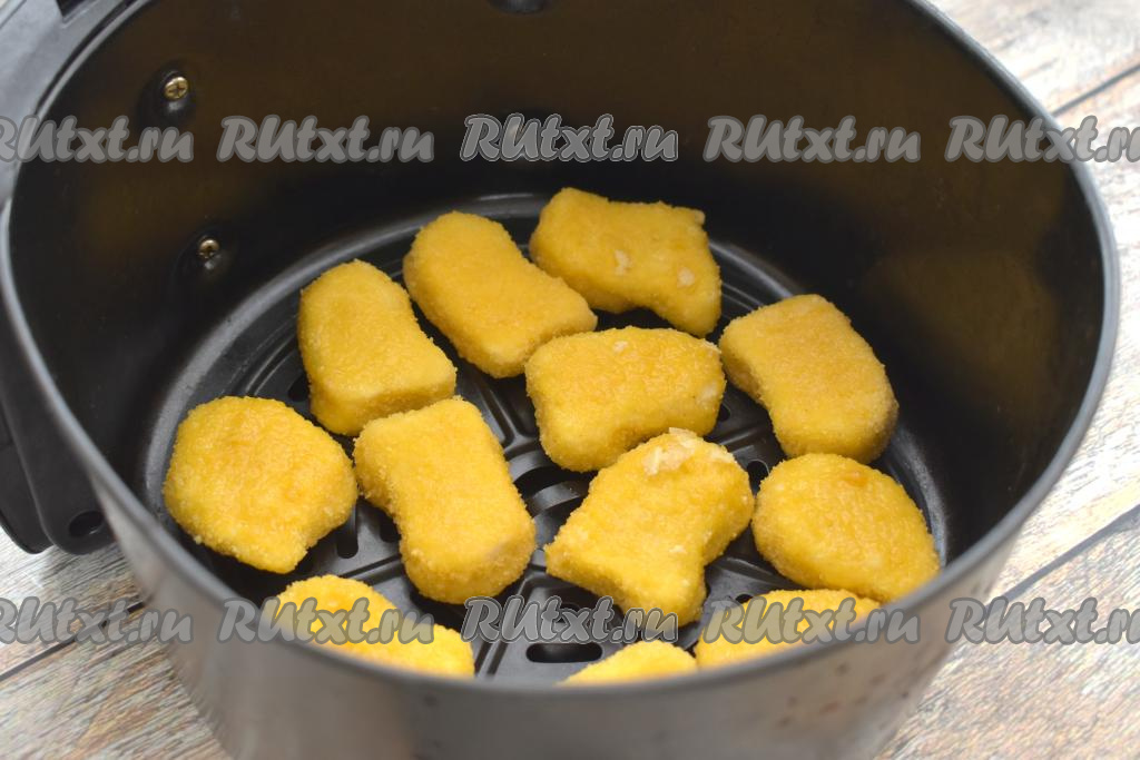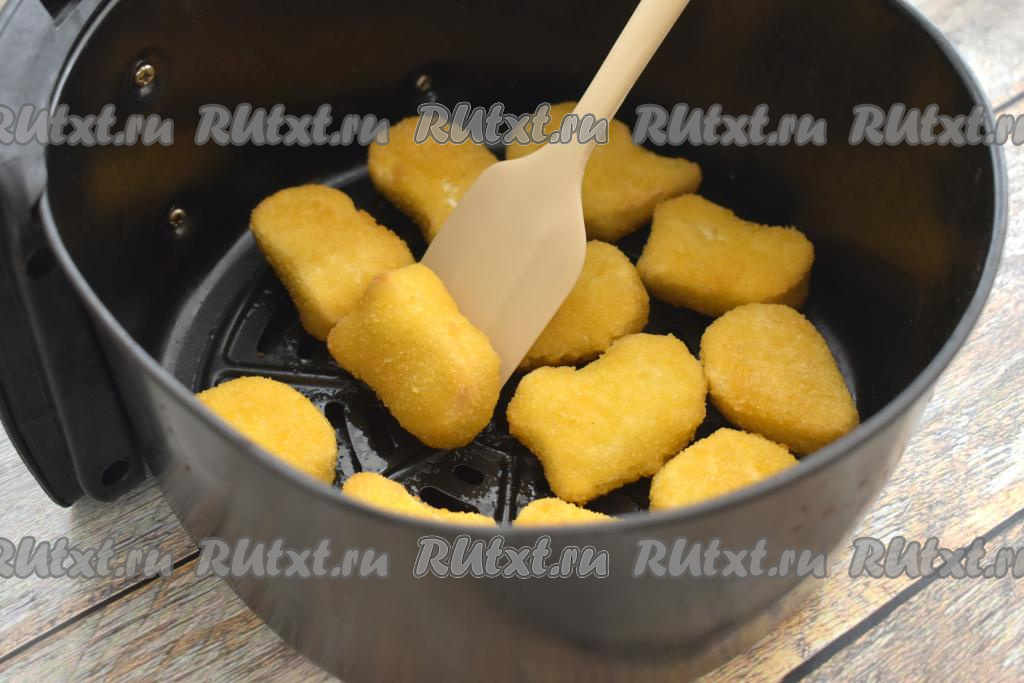 По прошествии 5 минут с начала приготовления достаём чашу из аэрогриля, наггетсы переворачиваем, отправляем в аэрогриль и запекаем оставшиеся 5 минут. Если наггетсы крупные, увеличьте время приготовления в аэрогриле на 2-3 минуты.